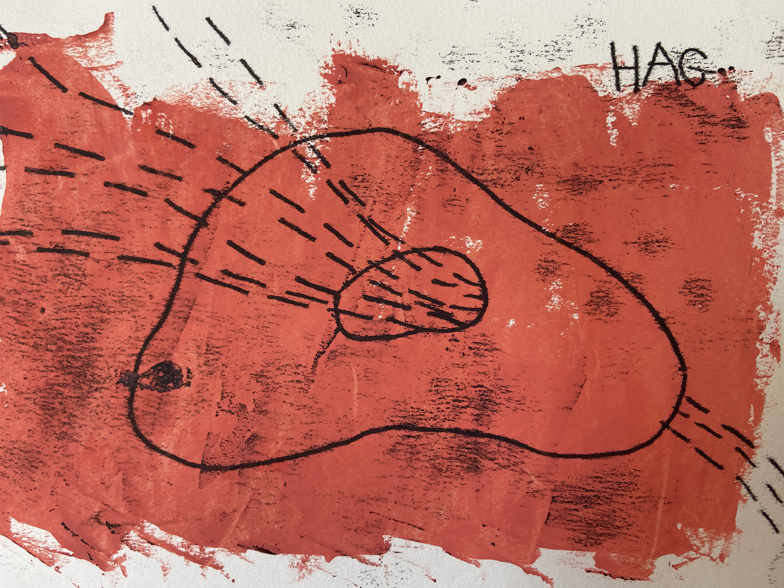 WORKS ON PAPER monoprints - hagstone series 2022 Ink on paper bad dreams 2022 Charcoal, pencil and avocado ink on paper doodles 2022 crayon on paper